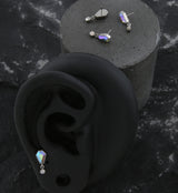 Threadless top piece that has a coffin design that is made from a rainbow aurora cz gem. Complete with a dangling 2mm clear cz gem. Fits all threadless posts. Made from ASTM F-136 titanium. Length is approximately 5mm. Design measures about 12mm x 5mm. Sold individually (1pc, top only).