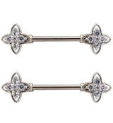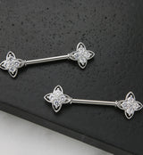 Nipple barbells that have sparkling four point stars on each end. Featuring a 14g straight barbell made from 316L stainless steel and 9/16” wearable area. Clear cz gems. Externally threaded for easy on & off. Sold as a pair (2pcs). For healed piercings.