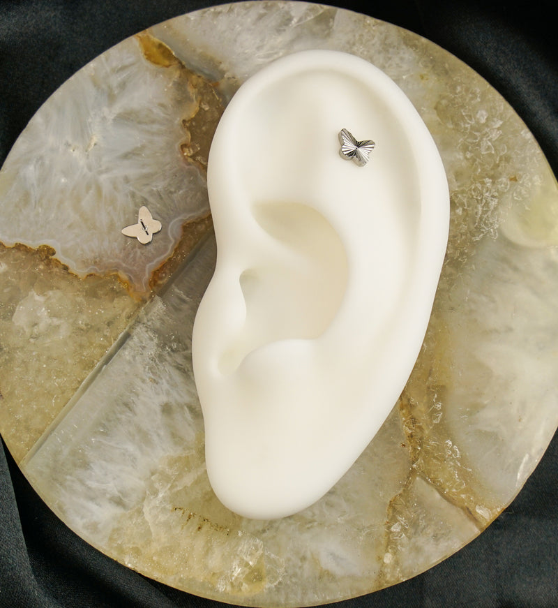 Threadless top piece that has a corrugated, butterfly-shaped design. It is made from durable ASTM F-136 titanium. Pin size is 25G. Fits most threadless posts. Top size measures 6mm x 5.1mm. Sold individually (top only).