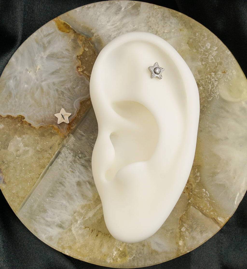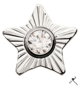 Threadless top piece that has a corrugated star-shaped disk design with a 2.5mm clear cz gem in the center. It is made from durable ASTM F-136 titanium. Pin size is 25G. Fits most threadless posts. Top size measures 6.3mm x 6mm. Sold individually (top only).