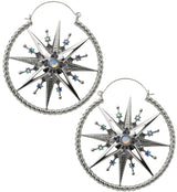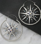 Plug hoops with a starburst design filled with sparkling blue aurora and light purple cz gems along with a centered, synthetic white opal gem. They are 20G and made from 316L stainless steel with a 316L stainless steel post. These styles are made to fit in any eyelet/tunnel style of plugs but can also be worn in normal ear piercings. Size is approximately 7.5mm x 6.5mm. Sold in pairs (2 pcs).