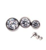 Sparkling threadless top piece that has a triple gem design that is slightly curved and gradually gets larger in size. Made from ASTM F-136 titanium and clear cz gems. Measures about 7.5mm x 3mm. 25G pin. Fits most threadless posts. Sold individually (top piece only).