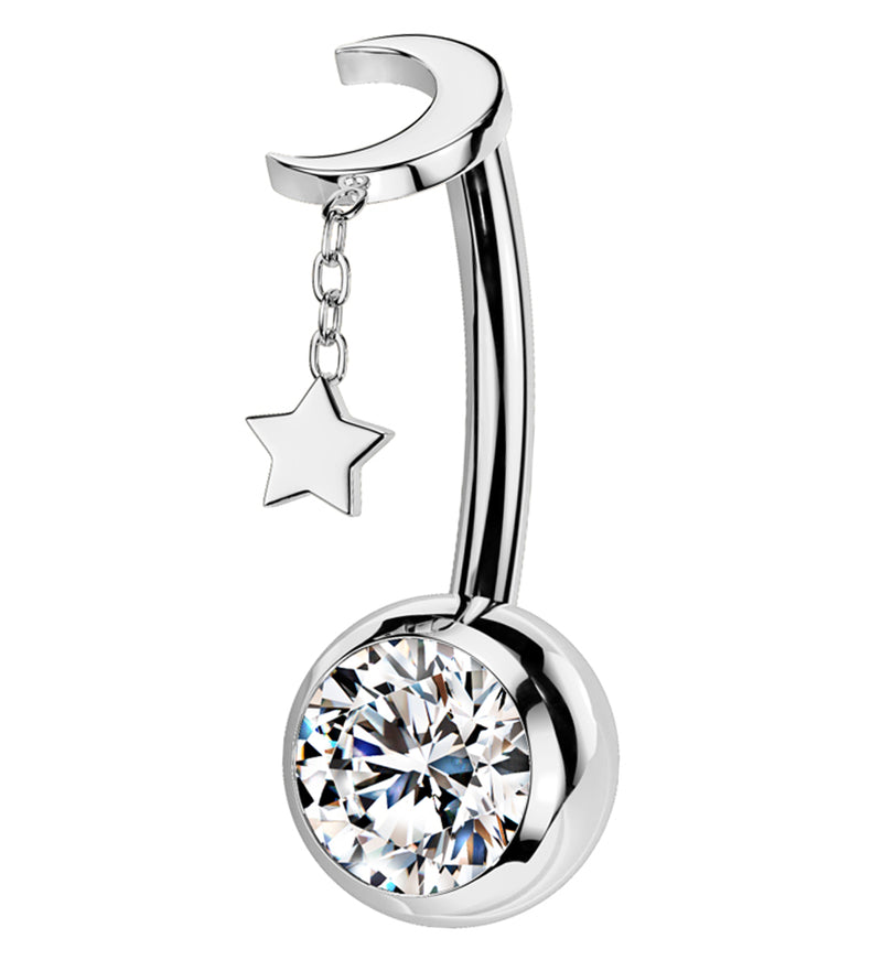 Crescent Dangle Star Clear CZ Titanium Threadless Belly Button Ring