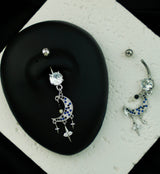 Beautiful belly button ring has a crescent moon shape that is filled with dark blue, black, and clear pave set cz gems. Attached to the top of the moon is a black bead and white bead and attached to the bottom of the moon are three 4-point stars, the center star accented with clear cz gems across the middle. The belly ring has a wearable length of 3/8" (10mm) and a gauge size of 14G. Made from 316L stainless steel. It has a 5mm externally threaded ball top with a 4mm clear cz inside and a prong set, 7mm clear cz gem bottom. For healed piercings. Sold individually.