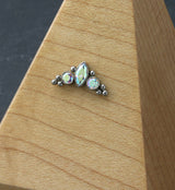 Stunning cz threadless top piece that has a crown-like design with a marquise rainbow aurora cz gem surrounded by other rainbow aurora cz gems and beads. Made from ASTM F-136 titanium. Measures about 11mm x 6mm. 25G pin. Fits most threadless posts. Sold individually (top piece only).