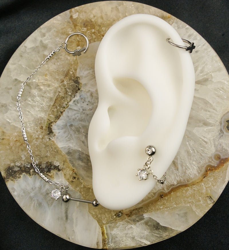 This stainless steel piercing chain is a nice piece that you can use to connect two ear piercings! There is an externally threaded barbell on one end (both sides come off) and an annealed ring on the other. Both have wearable sizes 18G with a 5/16" (8mm) length and inner diameter. The chain length measures about 70mm and is decorated with small, 4mm stacked steel cylinders throughout. On the barbell is a 4mm clear cz gem with another beaded, dangling clear cz gem attached. There is also a 6mm x 4mm cross on the ring! Sold individually. For healed piercings.