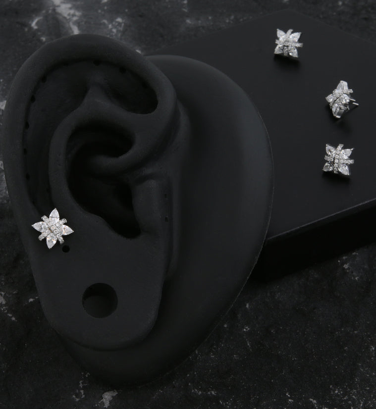 Threadless top piece that has a marquise clear cz gem square design wrapped with a cross of clear cz gems. Fits all threadless posts. Made from ASTM F-136 titanium. Length is approximately 5mm. Top size: 8.6mm x 8.6mm. Sold individually (1pc, top only).