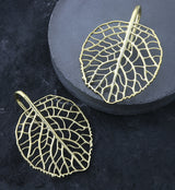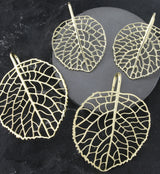 Lightweight brass earrings/hangers with a geometric fiddle leaf design. Size is 8G. Available in two sizes: Small and Large. Small measures at 63mm x 47mm with a weight of about 8.5 grams each. Large measures at 90mm x 70mm with a weight of 18 grams each. Made from brass. Not meant for long term wear. May oxidize under extreme moisture conditions. Sold in pairs (2pc). For healed piercings/lobes.