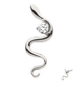 Threadless top piece that has a curving snake design with a 2mm clear cz gem accent. Made from ASTM F-136 titanium. Measures about 12mm x 4.5mm. 25G pin. Fits most threadless posts. Sold individually (top piece only).