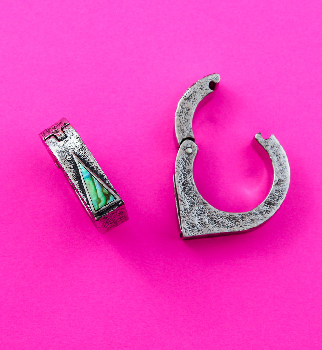 These exquisite handcrafted Cusp Triangle Abalone White Brass Hinged Hoop Ear Weights feature a unique abalone shell inlay and are sure to make a style statement. Made from casted white brass, each piece is sold in pairs (2pc) and measures 36mm x 30mm. Weights are 17 grams each and must be at least 0G (8mm) to wear. Note brass is not meant for long term wear and may oxidize under extreme moisture conditions. Great for healed piercings/lobes.