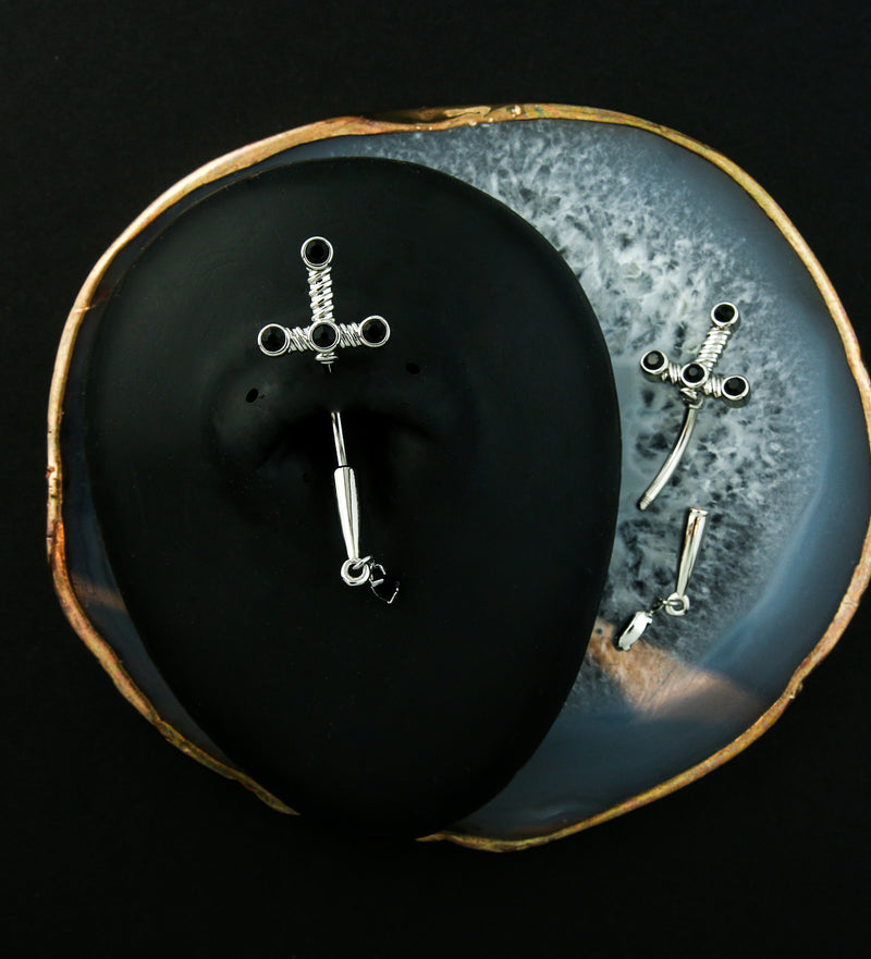 Externally threaded, belly button ring made from 316L stainless steel and black cz gems. The design is a dagger that goes through your navel. The top is the handle which is accented with black cz gems and the bottom point has an attached, dangling, oval, black cz gem. Design measures at 45mm x 13mm (including dangle). Size is 14G with a 3/8" (10mm) length. For healed piercings. Sold individually (1pc).