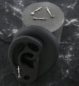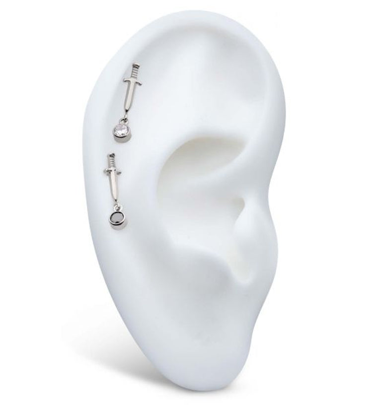 Internally threaded top piece that has a dagger design with a dangling round, bezel-set black cz gem. Size is 16G with M0.9 threading. Made from ASTM F-136 titanium. Design measures about 16.6mm x 3.9mm. Sold individually (1pc, top only).