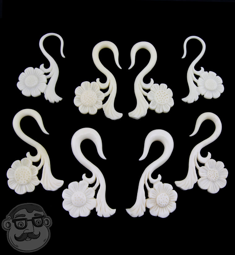Sold in pairs (2pc) Carved daisy design Sustainable water buffalo bone Pick from 12G - 0G Hand made Approximate dimensions below