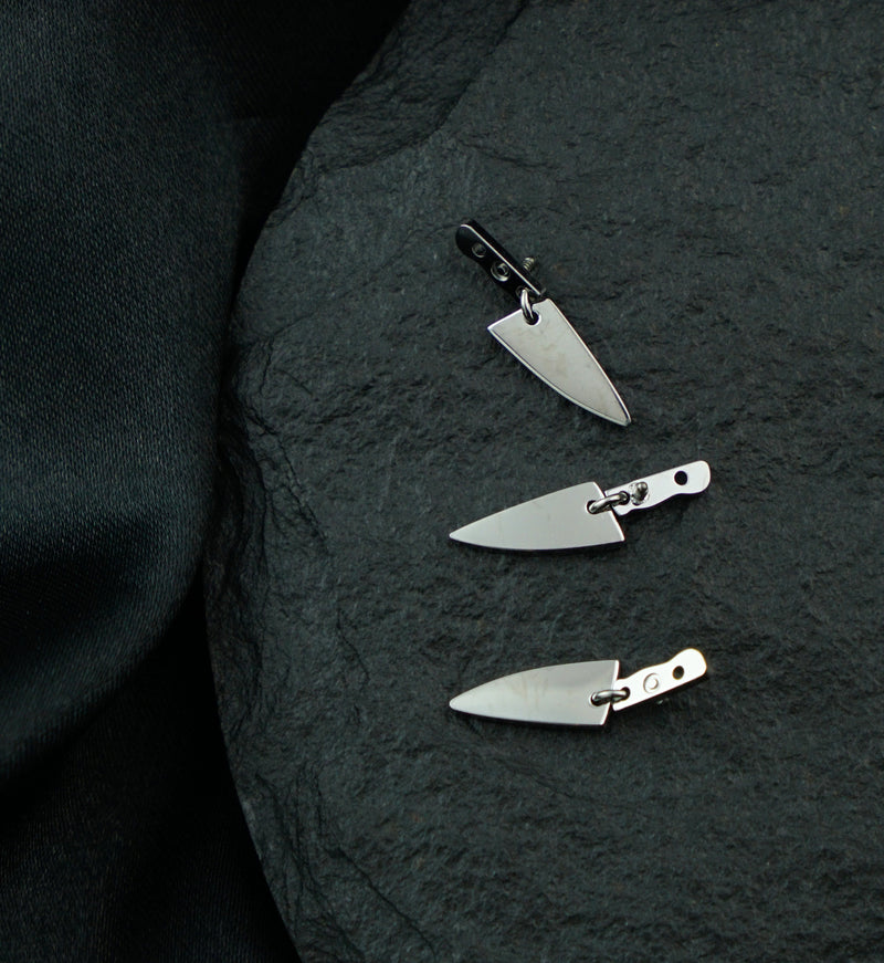 Internally threaded top piece that has a dangling blade attached. Made from durable ASTM F-136 titanium. Measures 16mm x 4mm. Size is 16G with M0.9mm threading. Edgy jewelry top for your cartilage or tragus piercing! Sold individually (top piece only).