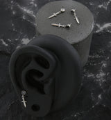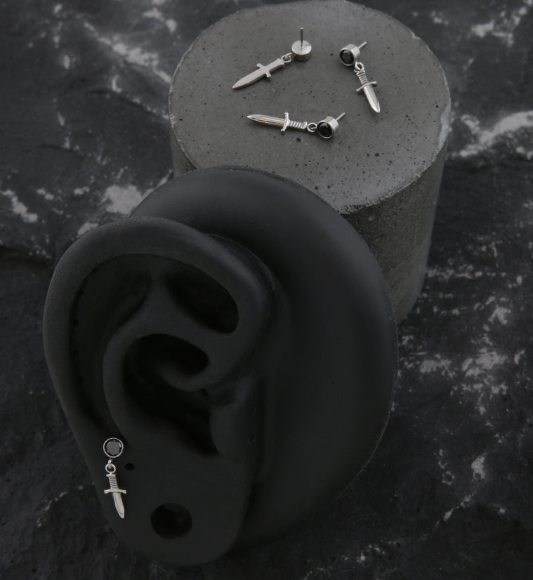 Threadless top piece that has a dangling dagger design attached to a round, bezel-set black cz gem. Fits all threadless posts. Made from ASTM F-136 titanium. Length is approximately 5mm. Design measures about 16.3mm x 3.5mm. Sold individually (1pc, top only).