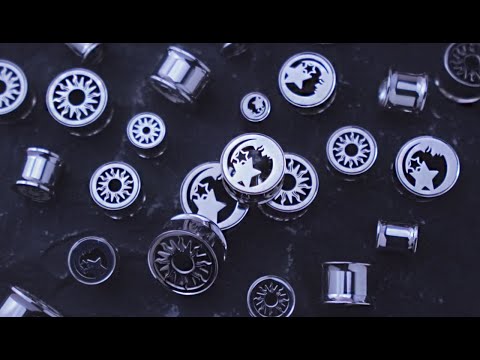 Mismatched plug tunnels made from 316L stainless steel that have a sun design on one plug and a crescent moon and star on the other plug. These plugs are double flared. Pick from 2G-5/8". Wearable area is about 8mm - 9mm. Full length is 10mm. Sold in pairs (2pcs). For healed lobes.