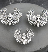 Stainless steel saddles with a death moth design. Made from 316L stainless steel. Available in sizes 0G (8mm) - 1" (25mm). Wearable area is about 5mm. Wear them on their own or wear them with ear weights to evenly distribute weight. Sold in pairs (2pcs).