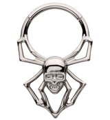 Edgy hinged segment ring made from ASTM F-136 titanium with spider design that has a skull face for the body. Size is 16G. Inner diameter size is 3/8" (10mm). The hinged design makes this piece easy to insert and remove. Great for cartilage or septum piercings! Spider design hangs down about 12mm and is about 13mm wide. Sold individually (1pc).