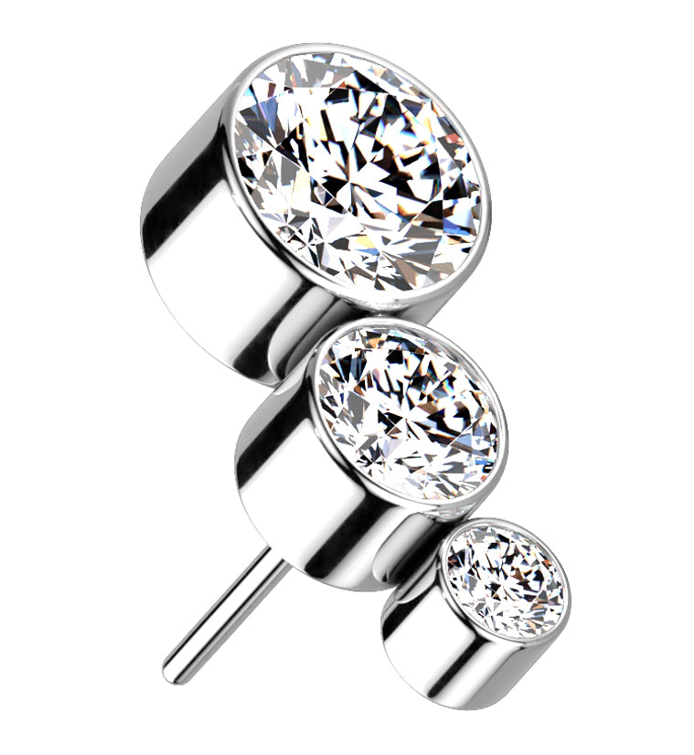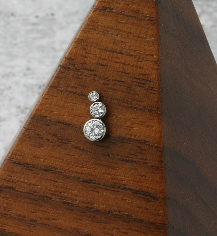 Sparkling threadless top piece that has 3 cz gems that are slightly curved and gradually get larger in size. Made from ASTM F-136 titanium and clear cz gems. Measures about 9mm x 4mm. Fits all threadless posts (14G - 20G) . Sold individually (top piece only).