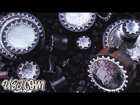 Double flared plugs made from areng wood with a hammered, white brass inlay in a decorative design. Handcrafted and polished. Sold in pairs (2 pcs). For healed lobes/piercings.