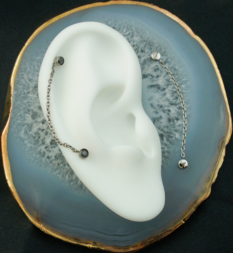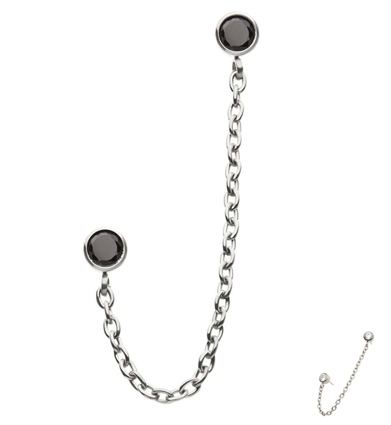 Two threadless round black cubic zirconia gem tops with a connecting, dangling rolo chain. Made from durable ASTM F-136 titanium milled in Japan. Chain measures 40mm long. 25G pins. Fits most threadless posts. Connect two piercings with this pretty chain! Sold individually (two top pieces only).
