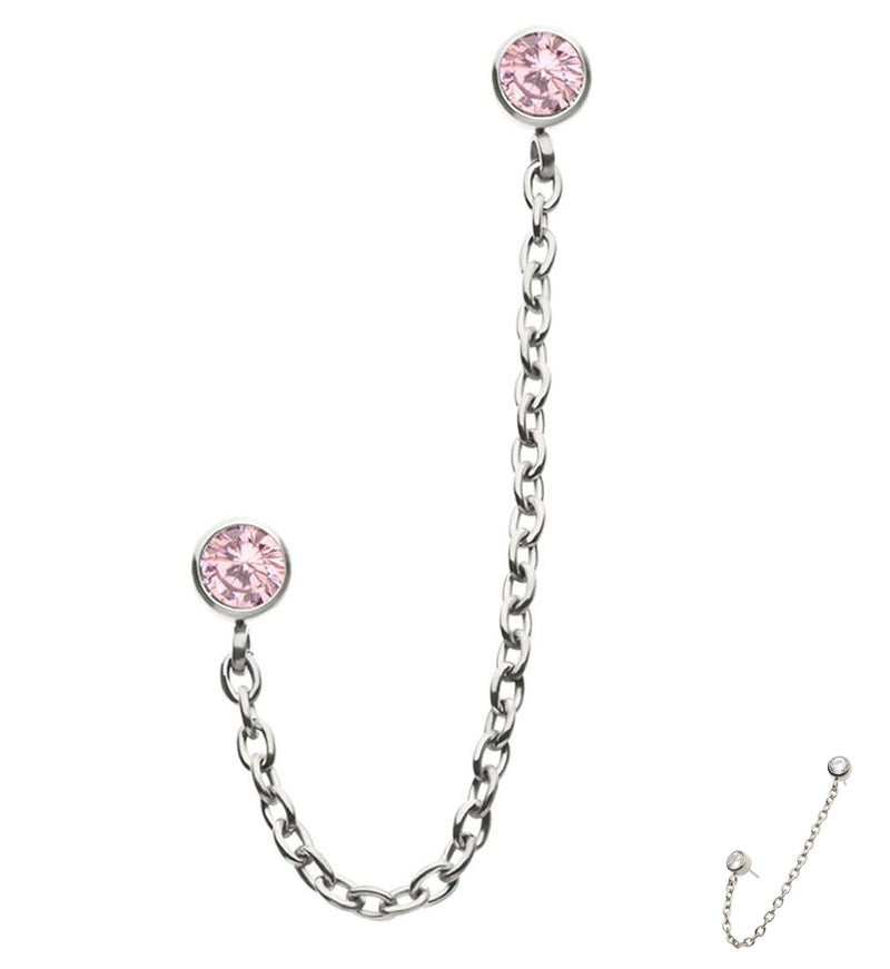 Two threadless round pink cz gem tops with a connecting, dangling rolo chain. Created from ASTM F-136 titanium milled in Japan. Chain measures around 40mm long. 25G pins. Fits most threadless posts. Connect two piercings with this pretty chain! Sold individually (two top pieces only).
