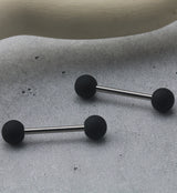 Externally threaded barbell made from 316L stainless steel with two 6mm black silicon balls on either end. Full length is 28mm (1 & 1/8") with a barbell length of 16mm (5/8"). Size 14G. For healed piercings.
