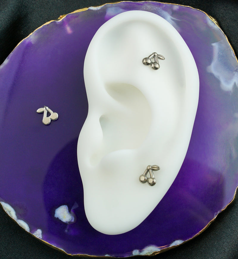 Threadless top piece that is shaped like two cherries. Made from durable ASTM F-136 titanium. Measures about 6mm x 5.5mm. Fits most threadless posts. Cute option for your cartilage or tragus piercing! Sold individually (top piece only).