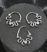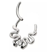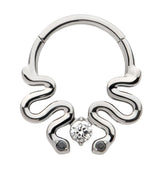Dress up your septum or cartilage piercing with this curvy snake hinged segment ring! This piece is made from ASTM 136 titanium with a double curving snake design that meets in the middle at a 2.5mm clear cz gem. The eyes of the snakes are made with black cz gems. Size is 16G with an inner diameter size of 3/8" (10mm). Hinge opens and clicks closed. Sold individually (1pc).