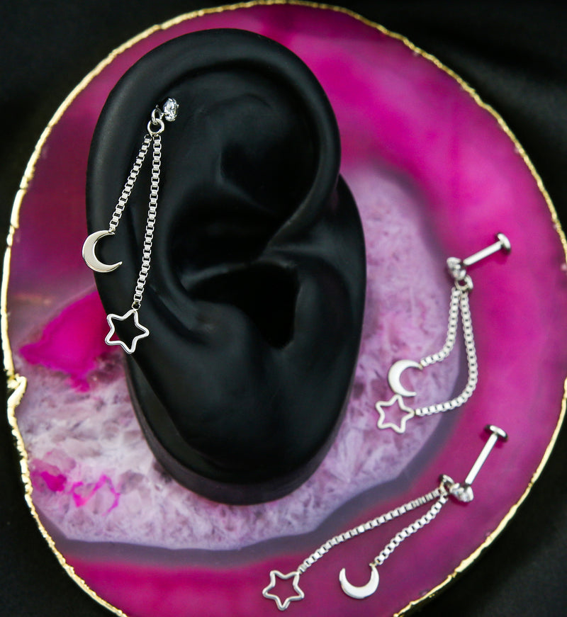 This internally threaded labret is a dangling piece to add to your collection. It features a sparkling clear 3mm gem and is made from 316L stainless steel. It also features 35mm dangling design made up of two box chains with a crescent moon on the end of one and a hollow star on the end of the other. Choose between two different size wearables: 1/4" (6mm) and 5/16" (8mm). It has a 4mm flat back. Sold individually (1pc). Intended for healed piercings.