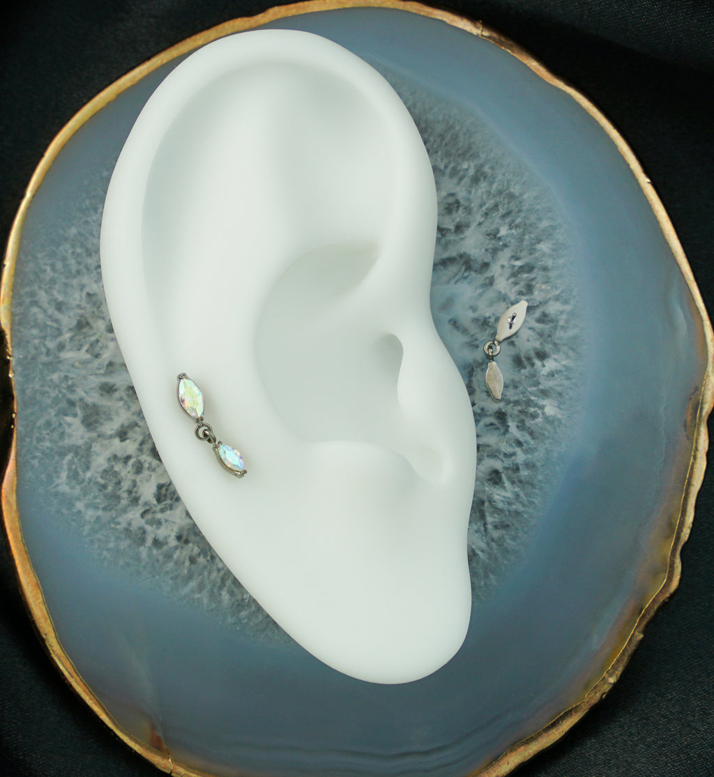Made with ASTM F-136 titanium, this threadless top piece has a 6mm marquise, rainbow aurora cz gem connected to a dangling, 5mm, marquise-shaped, rainbow aurora cz gem. Full design measures 13.7mm x 2.5mm. This top has a threadless design and fits most threadless posts. Sold individually.