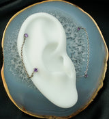 Two threadless round amethyst cz gem tops with a connecting, dangling rolo chain. Made from ASTM F-136 titanium milled in Japan. Chain measures approximately 40mm long. 25G pins. Fits most threadless posts. Connect two piercings with this shining chain! Sold individually (two top pcs only).