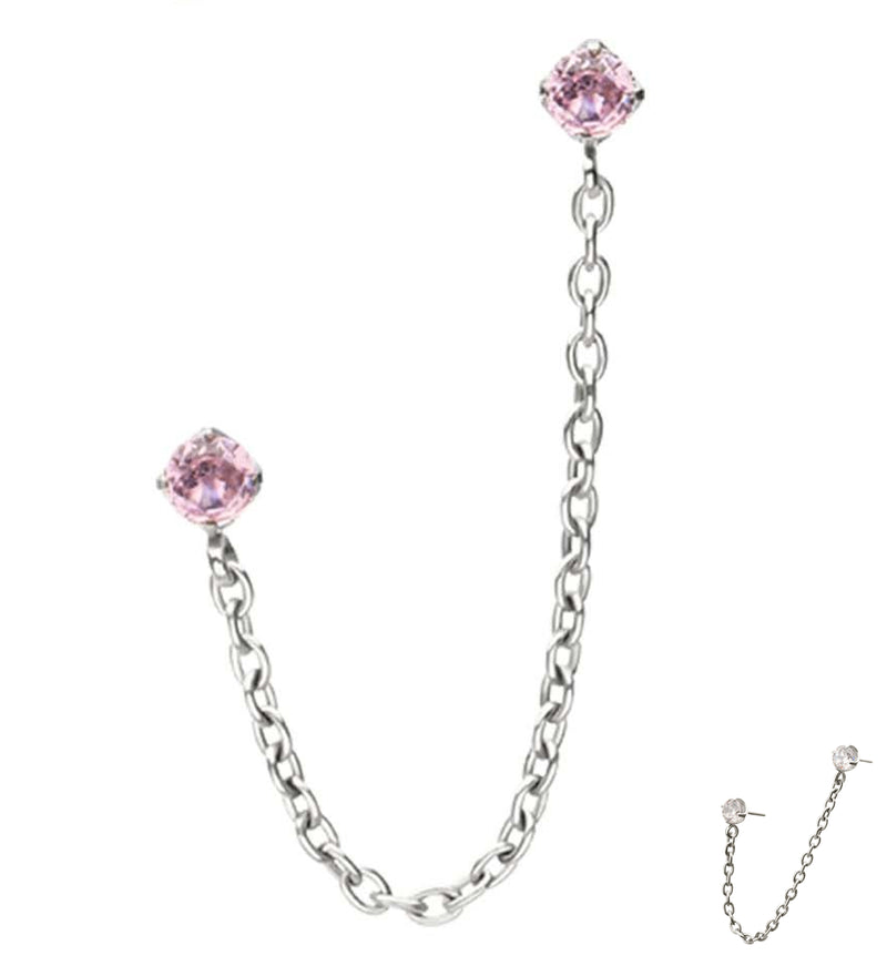 Two threadless round, prong-set, pink cz gem tops with a connecting, dangling rolo chain. Created from ASTM F-136 titanium milled in Japan. Chain measures at 40mm long. 25G pins. Fits most threadless posts. Connect two piercings with this pretty chain! Sold individually (two top pcs only).