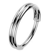 Hinged segment ring made from 316L stainless steel with a hoop design that has a double row along the bottom. Available in size 20G with multiple diamter sizes to choose from: 1/4" (6mm), 9/32" (7mm), 5/16" (8mm), 3/8" (10mm). The hinged design makes this piece easy to insert and remove. Sold individually (1pc).