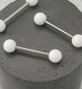Classic double acrylic ball barbells. Size is 14G with a 5/8" (16mm) barbell. Made from 316L stainless steel and two white acrylic balls. Ball size is 6mm. Externally threaded. Sold individually (1pc).