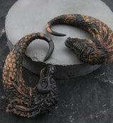 Our Dragon Areng Wooden Hangers come in a range of 8G (3mm) to 00G (10mm) sizes. Carefully crafted by hand, each piece boasts a unique and intricately detailed dragon head design carved into Saba wood. Please note that the pattern and color of each hanger may vary. Areng Wooden Hangers are handcrafted from areng wood and feature a unique, carved dragonfly design. These hangers come in 8G - 5/8" variations, so you can pick the perfect size for your needs. Additionally, each piece is slightly unique in terms of color and pattern - we will do our best to get you a matching pair. Sold in pairs (2 pieces).