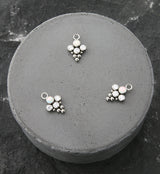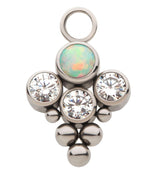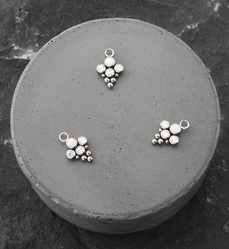 Shimmering charm that has an O-ring on the end to hang from a cartilage/tragus/septum hoop ring. Made from ASTM F-136 titanium. Decorated with three bezel set clear cz gems and one synthetic white opal gem. Accented with a beaded design along the bottom. Measures about 10mm x 7.5mm. Sold individually (1 piece).