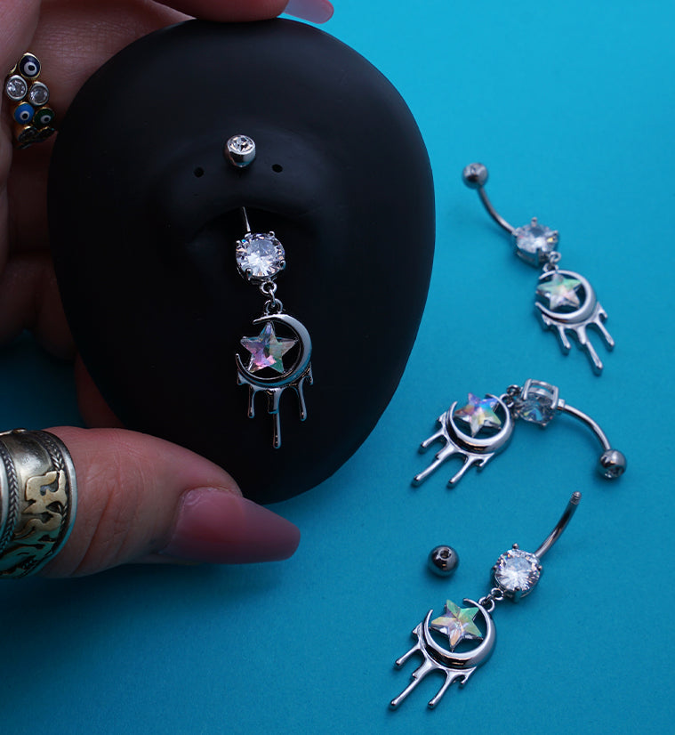 This Dripping Half Moon Rainbow Aurora Star CZ Stainless Steel Belly Button Ring is ideal for healed navel piercings. Crafted from surgical 316L stainless steel, this single piece features a 14 gauge barbell with a 3/8" (10mm) barbell and a dangling crescent moon design complete with a dripping design and accented with a star shaped rainbow aurora cz gem. Top gem size is 5mm and the bottom gem size is 8mm. Dangling design is about 25mm x 12mm.