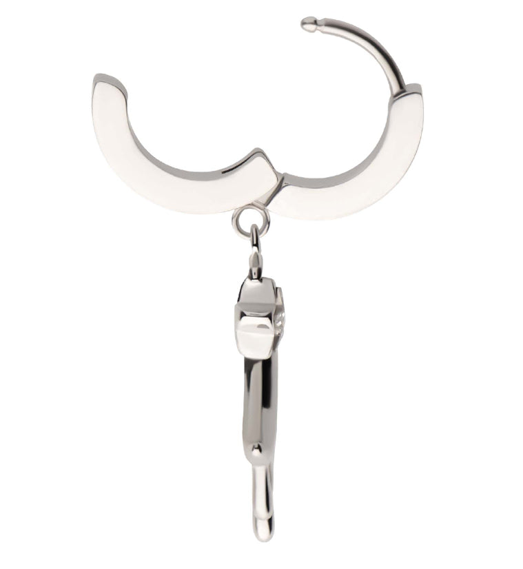 Hoop-style earrings with a dangling mushroom trio attached that measure about 25mm x 12mm. Made from 316L stainless steel with a hinged clasp. Size is 18G. Diameter is 3/8" (10mm). Total length is approximately 36mm. The hinged design is easy to open and close. Sold in pairs (2 pieces).