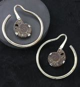 Beautiful white brass ear weights with a prong set ammonite fossil hanging in the middle. Hoop design. Weight is about 38 grams each. Must be 4G or bigger to wear. Width: 64mm. Height: 80mm. Made from white brass. Brass is not meant for long term wear. It may oxidize under extreme moisture conditions. For healed lobes. Sold in pairs (2pcs).