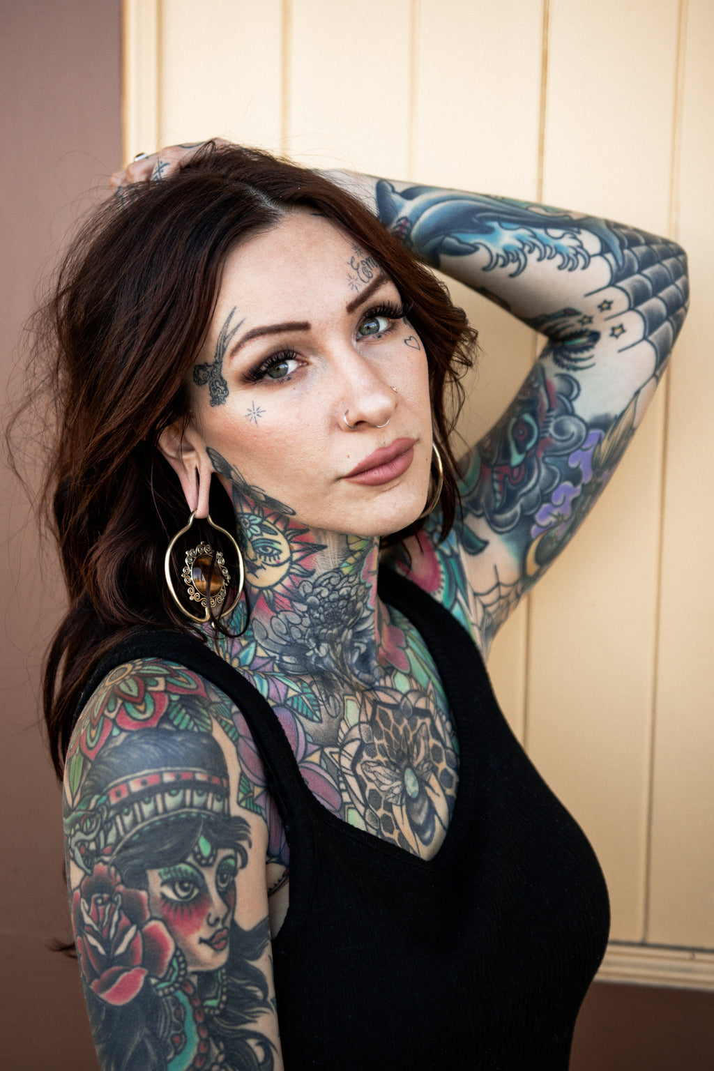 Mesmerizing brass ear weights with a 1" (25mm) round tigers eye stone hanging in the middle. Hoop design. Weight is about 23 grams each. Must be 8G or bigger to wear. Width: 65mm. Height: 80mm. Made from yellow brass. Brass is not meant for long term wear. It may oxidize under extreme moisture conditions. For healed lobes. Sold in pairs (2pcs).