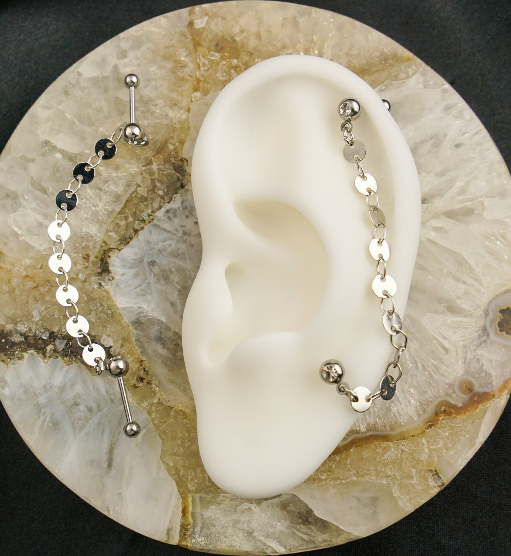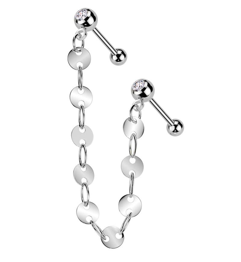 Dangling stainless steel piercing chain that is decorated with flat disk links throughout. The wearable size of each barbell is 18G with a 5/16" (8mm) length. The chain length measures about 56mm. On each barbell is a 4mm clear cz gem with a 3mm ball on the other end. Both ends are externally threaded. Made from 316L stainless steel. Sold individually. For healed piercings.