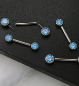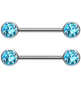 Shining bezel set aqua cz gem titanium threadless nipple ring barbells! Made with hypoallergenic ASTM F-136 titanium. Featuring a 14g straight barbell and a choice of ½” and 9/16” barbell lengths. Accented with a 5mm or 6mm cz gem on either side depending on barbell length. Sold as a pair (2pcs).