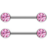 Pretty bezel set pink cz gem titanium threadless nipple ring barbells! Constructed with hypoallergenic ASTM F-136 titanium. Featuring a 14g straight barbell and a choice of ½” and 9/16” barbell lengths. Accented with a 5mm or 6mm cz gem on either side depending on barbell length. Sold as a pair (2pcs).