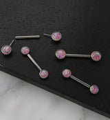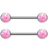 Double bezel set synthetic pink opalite gem titanium threadless nipple ring barbells! Made with hypoallergenic ASTM F-136 titanium. Featuring a 14g straight barbell and a choice of a 1/2" or 9/16” barbell length. Accented with a 5mm or 6mm front-facing opalite gem on either side depending on barbell length. Gems are flat on top. Sold as a pair (2pcs).