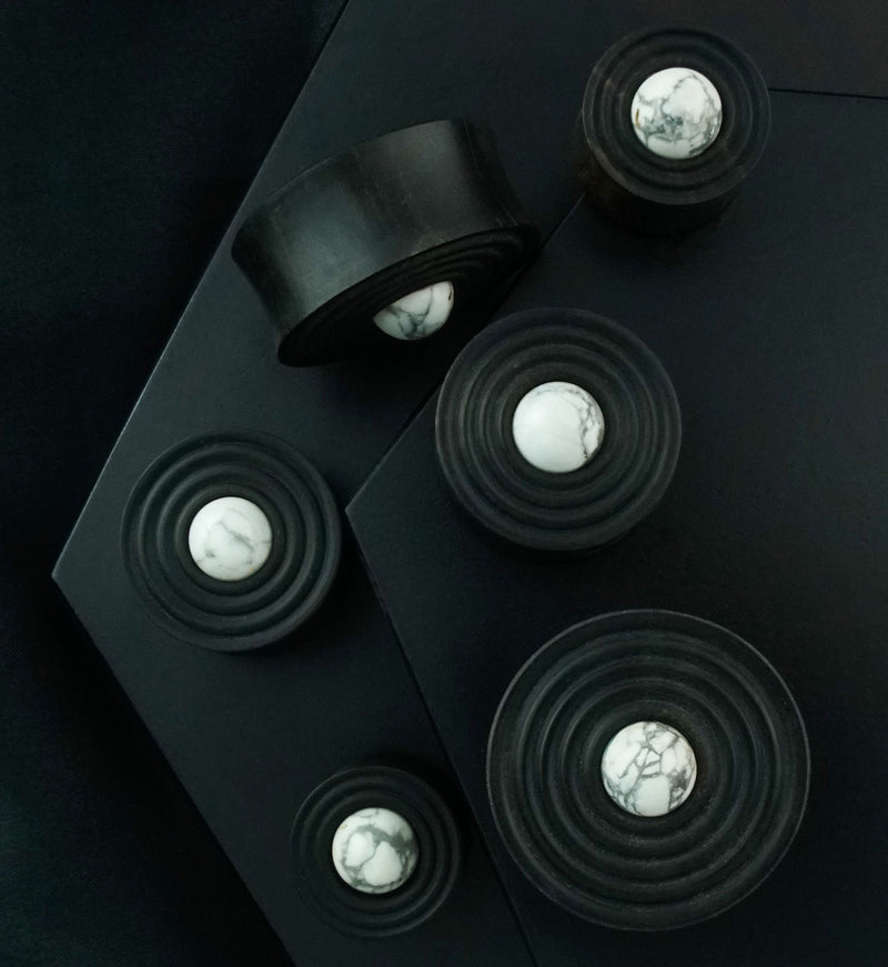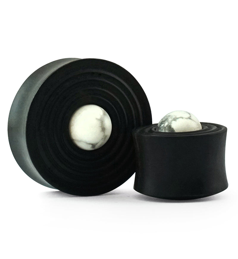 Handcrafted, areng wood plugs with a carved circular, geometric design that has a 12mm white howlite stone inlay in the center. Each piece will be one of a kind in color and pattern due to the nature of the wood and the stone, but we will do our best to find you a matching pair. Do not leave these in direct sunlight or extreme moisture conditions. This product is available in sizes 3/4" (19mm) - 1 & 1/4" (32mm) with a 13mm wearable area. For healed piercings/lobes. Sold in pairs (2pcs).