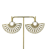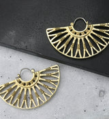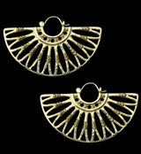 Golden brass hangers/earrings with an intricate, beaded design. Size is 18G with measurements of 57mm x 35mm. Each earring weighs about 17 grams. Made from brass with a ASTM F-136 titanium clasp. Sold in pairs (2 pieces).