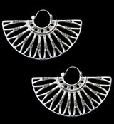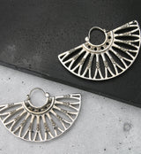 Silver brass hangers/earrings with an intricate, beaded design. Size is 18G with measurements of 57mm x 35mm. Each earring weighs about 17 grams. Made from white brass with a ASTM F-136 titanium clasp. Sold in pairs (2 pieces).