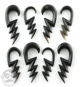 Cool lightning shaped horn hangers! Made from genuine buffalo horn, each pair is smooth, polished, and uniquely patterned—no two are exactly alike! We’ll match you with a complementing pair. Available in sizes from 8G (3.2mm) to 00G (10mm), they’re designed for healed lobes only and not for stretching. Embrace the wild side with these eye-catching, organic statement pieces!