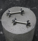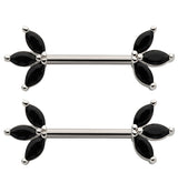 Black nipple barbells with a triple marquise black cz design on either side, accented with beads. Made from 316L stainless steel. Size is 14G with a barbell length of 9/16" (14mm). Externally threaded. Intended for healed piercings. Sold in pairs (2 pcs).